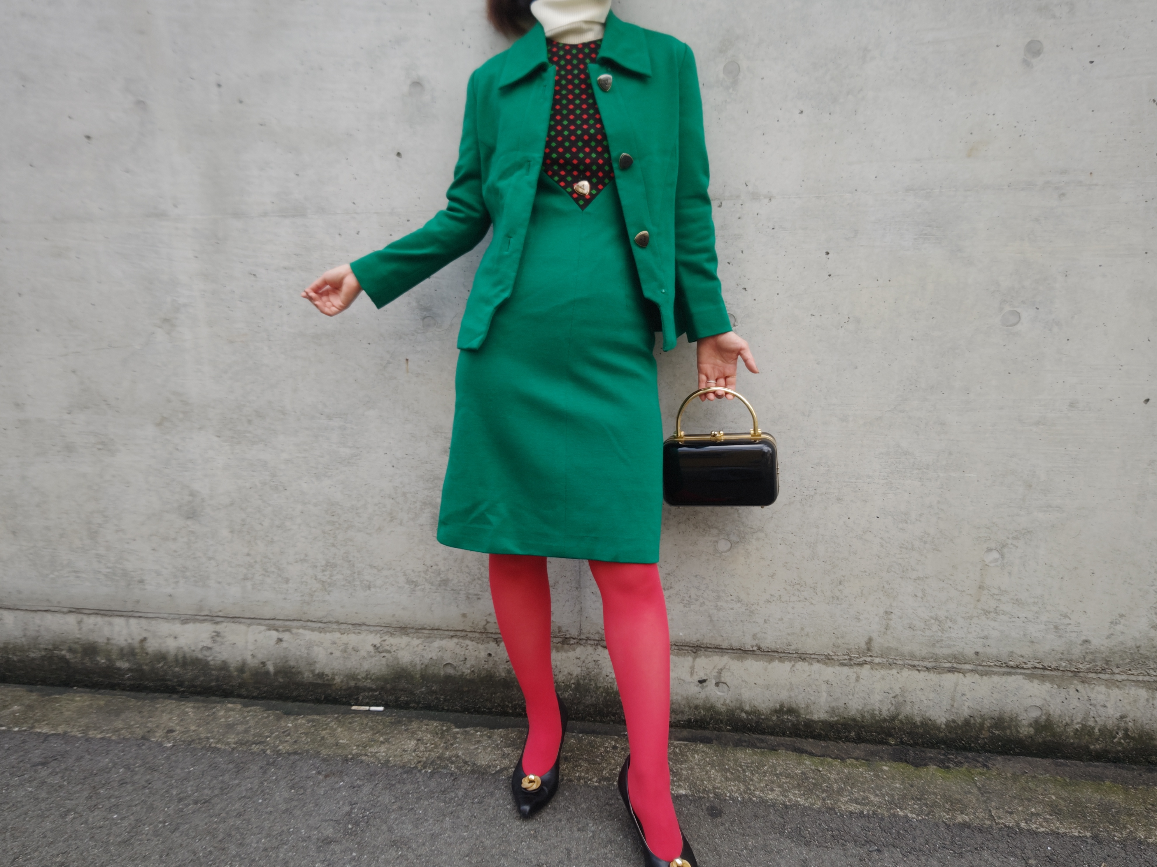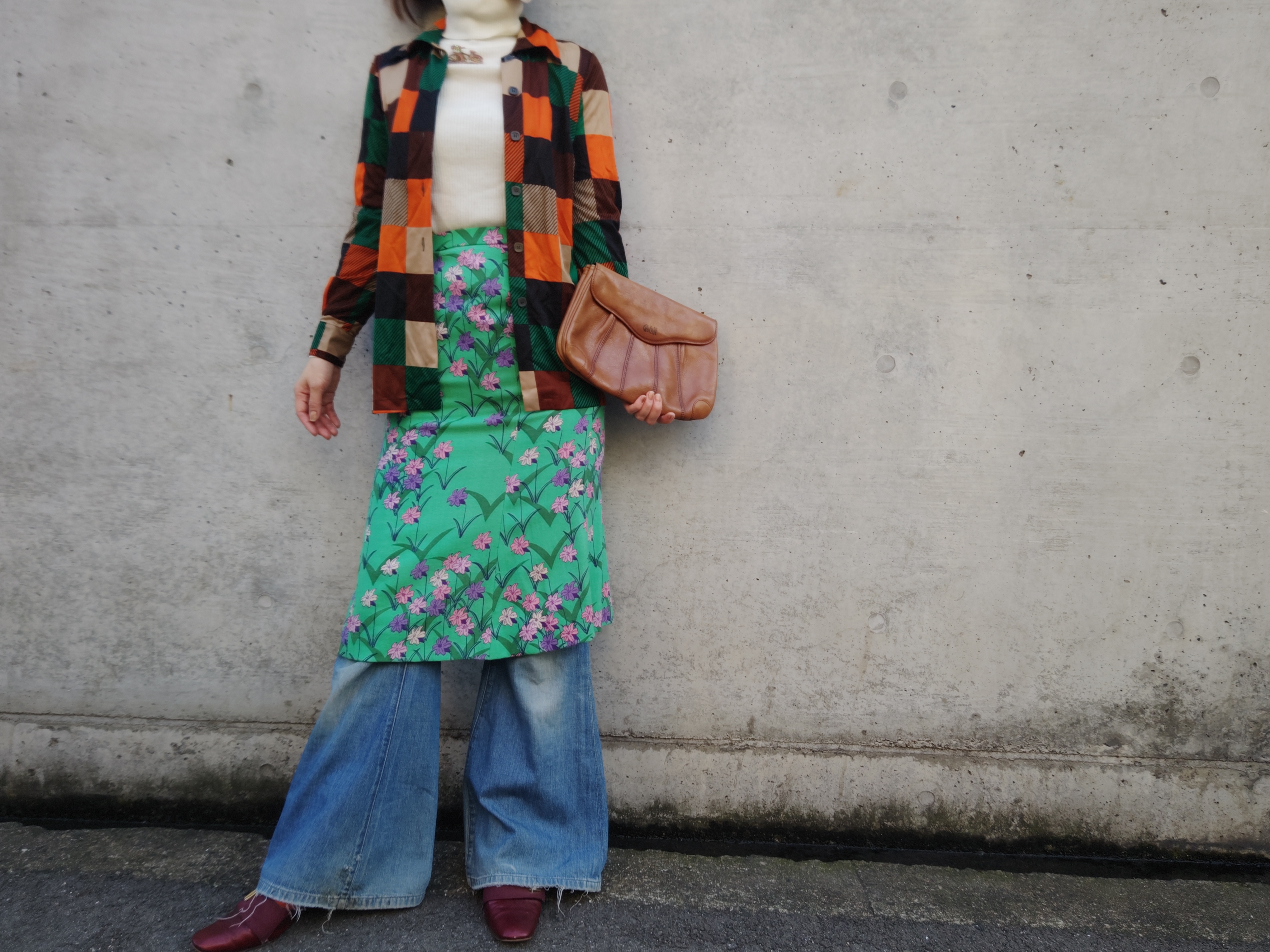 緑・ピンクお花x千鳥格子柄♪レトロセットアップ