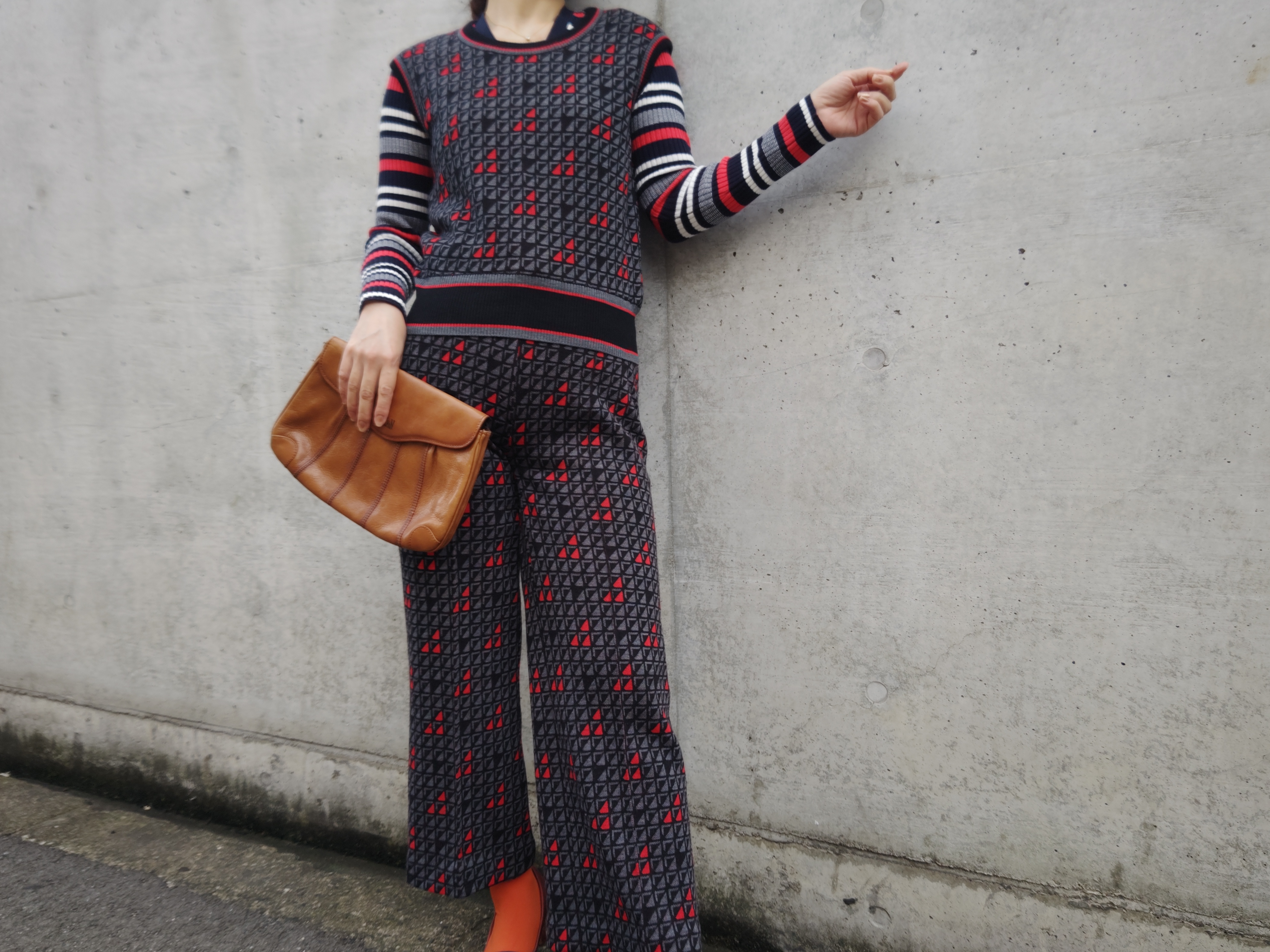 ワールド製*赤・黒・グレーレトロ幾何学柄★ベスト&パンツセットアップ