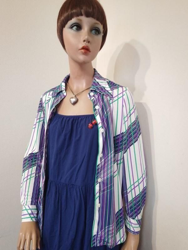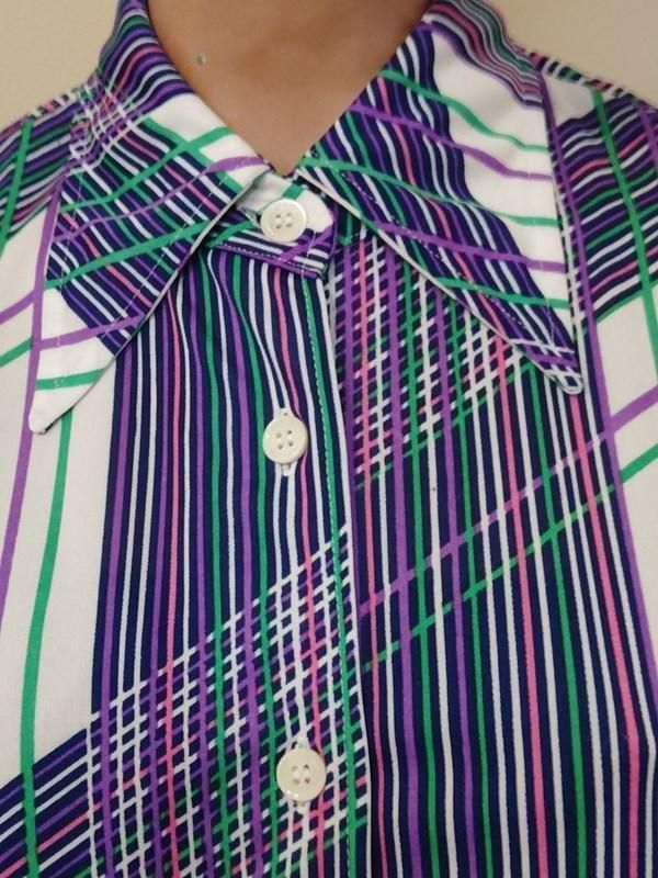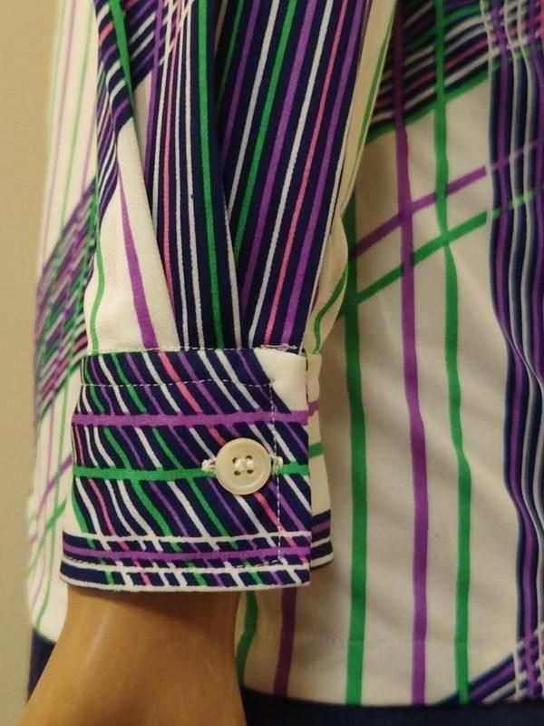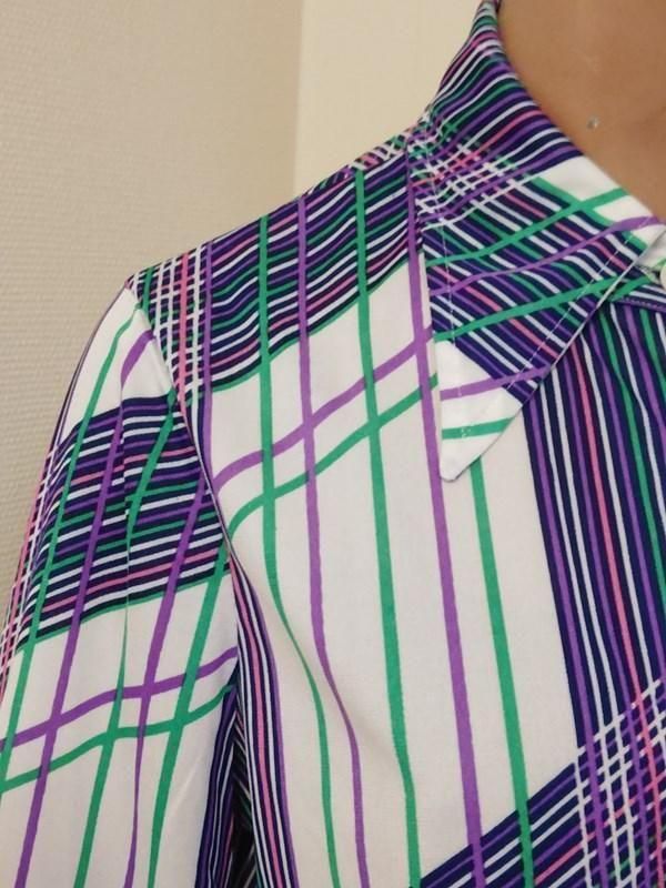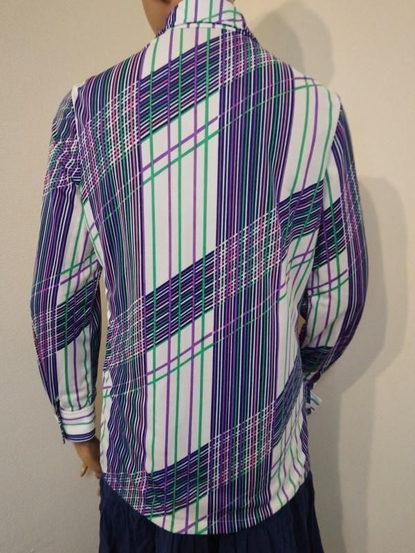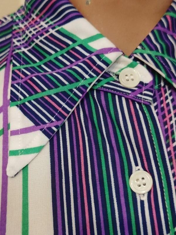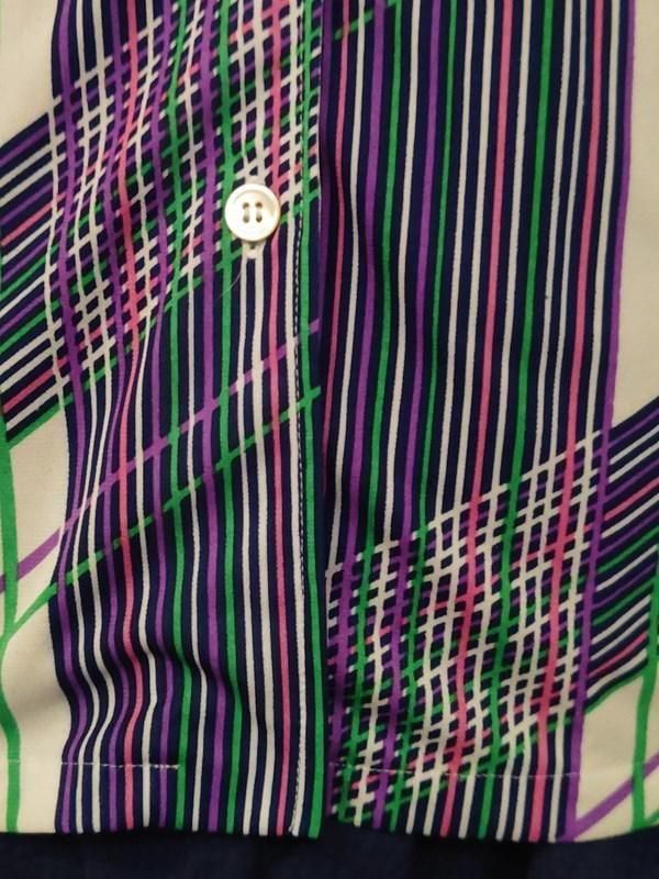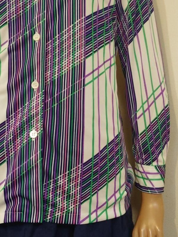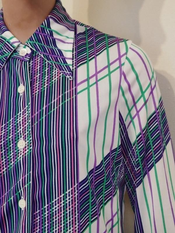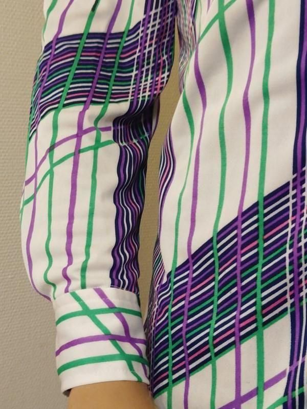 白地に紫・緑・ピンク・黒・白の色々ストライプ柄が