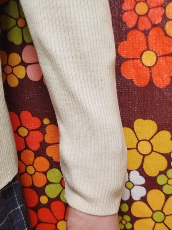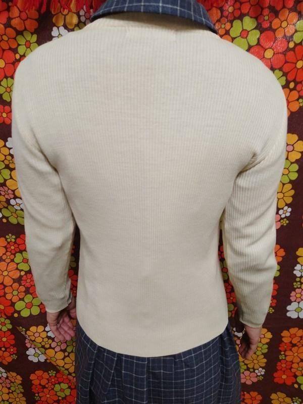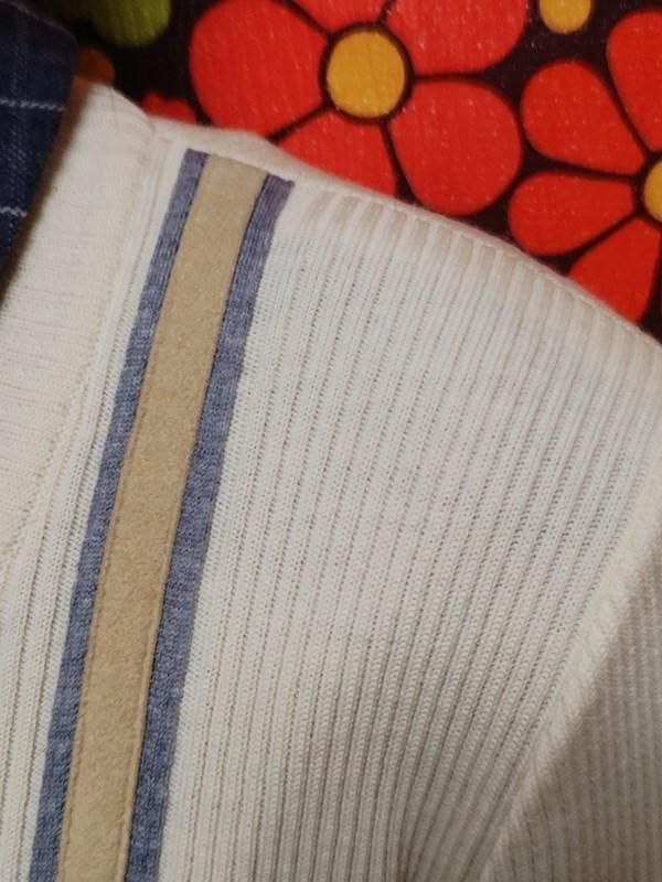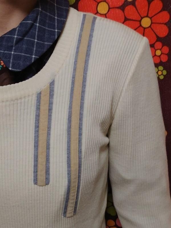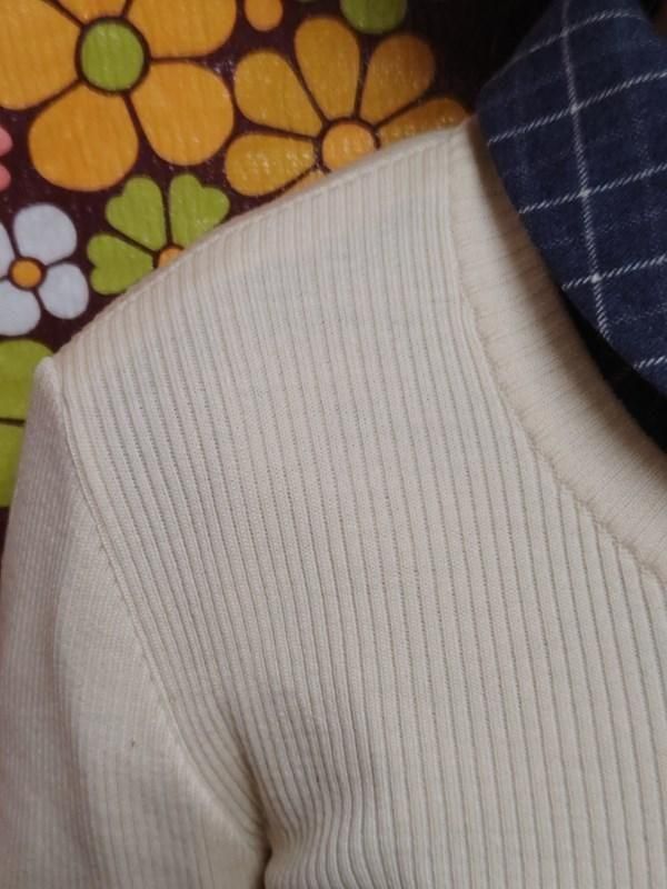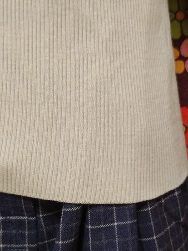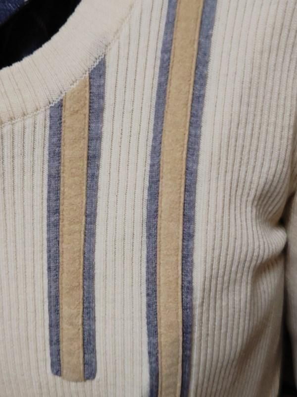 クリーム色のリブニットに、左肩の太いラインがポイントと