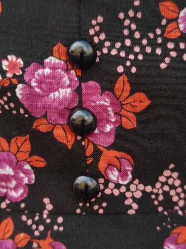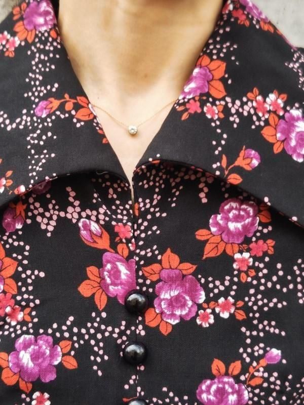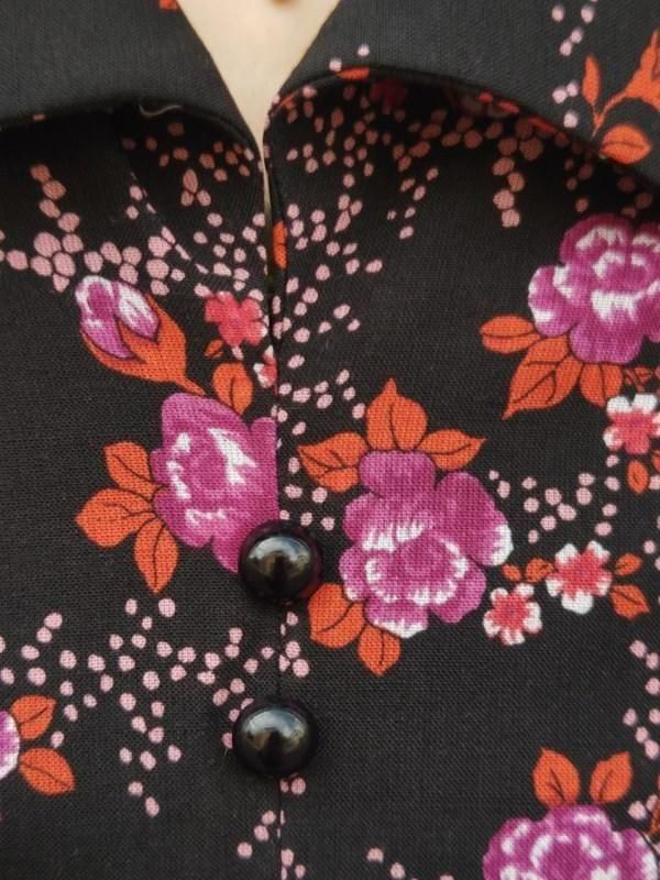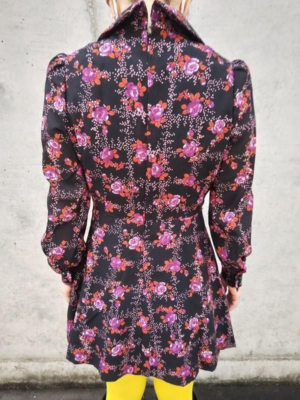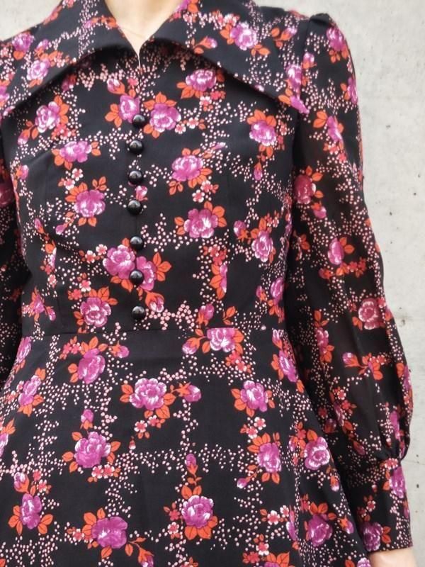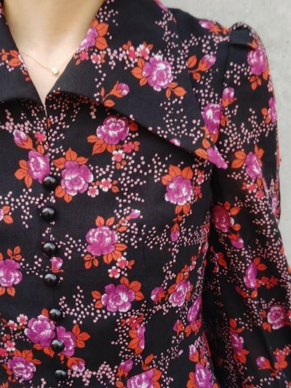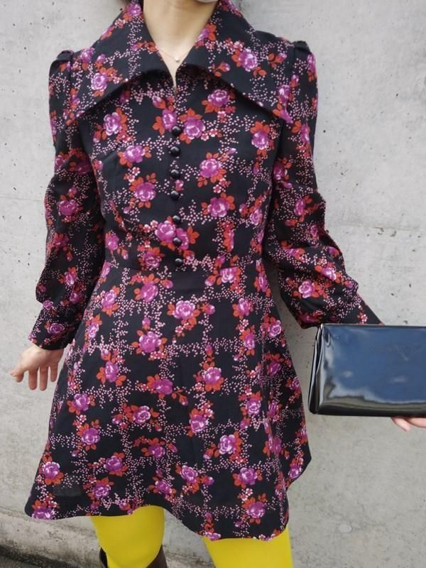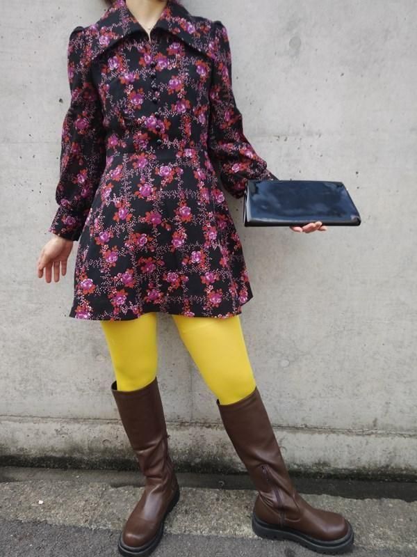 大きな襟、黒コロンボタン、パフスリーブ、ミニ丈など