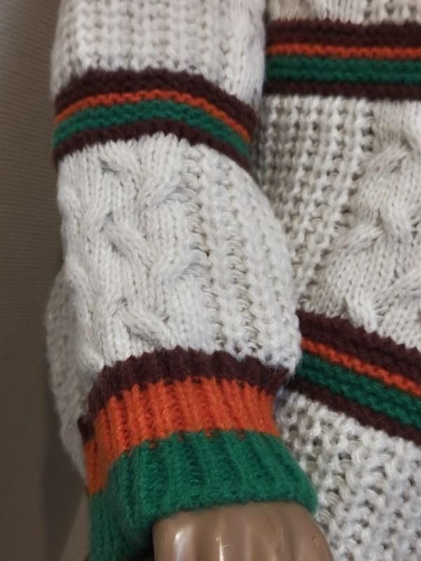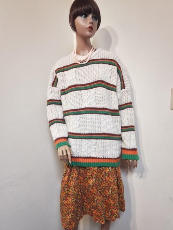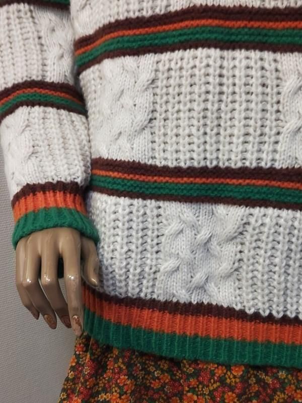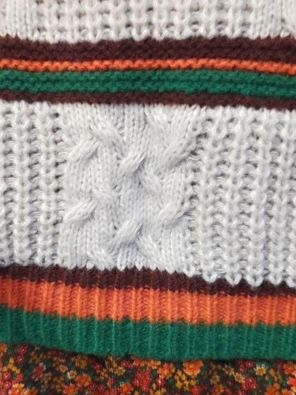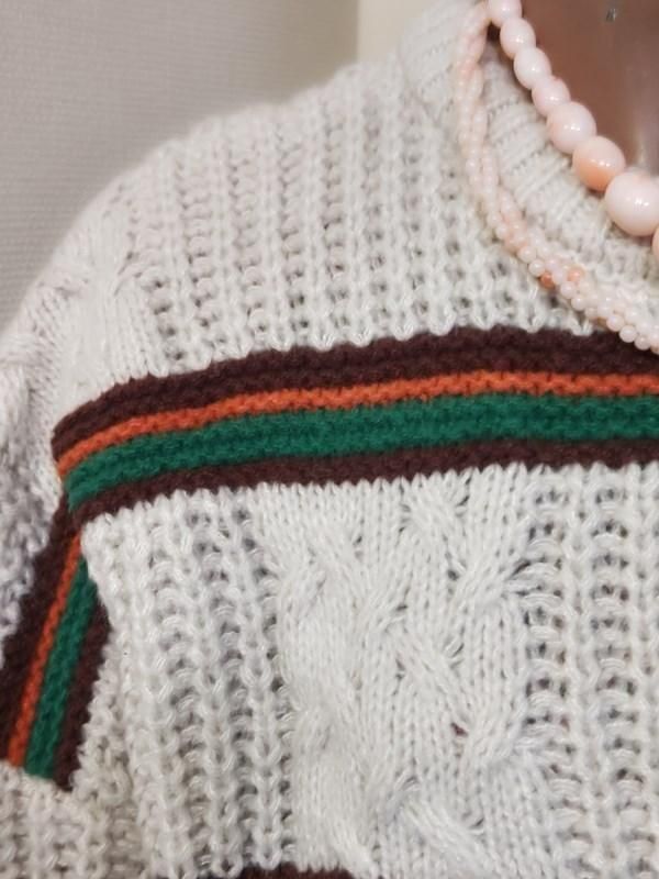 クリーム色ベースに緑・オレンジ・茶のボーダー柄が