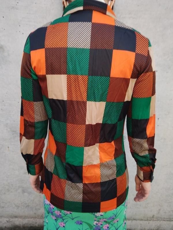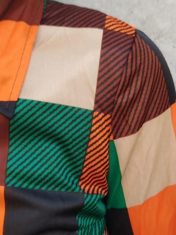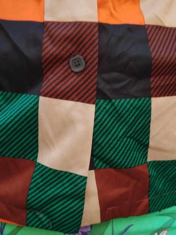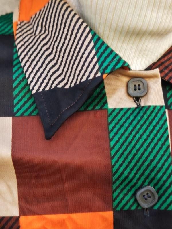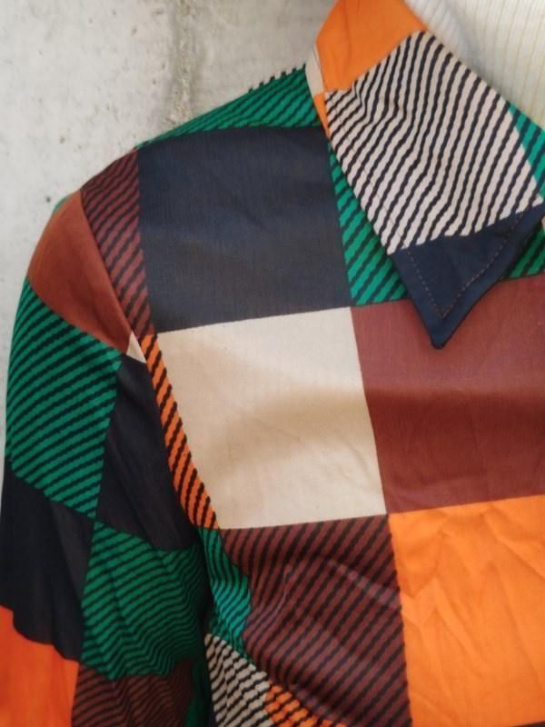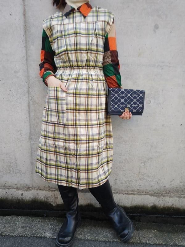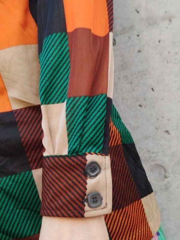 緑・オレンジ・黒・茶・ベージュのチェック&ボーダー柄が