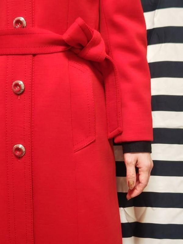 大きな襟、豪華ボタン、共布ベルト付き、両サイドポケット